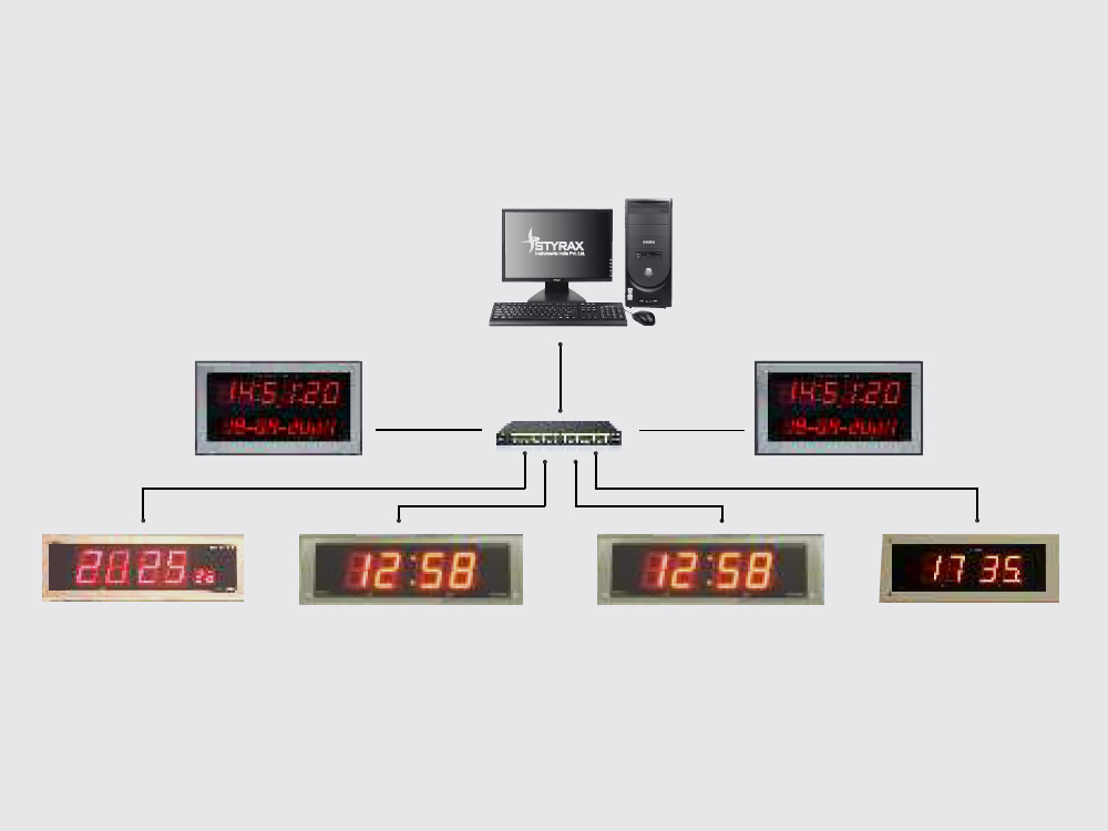 Styrax manufactures PoE network clocks draw both power and time updates from Ethernet 10/100Mbps port using SNTP protocol.